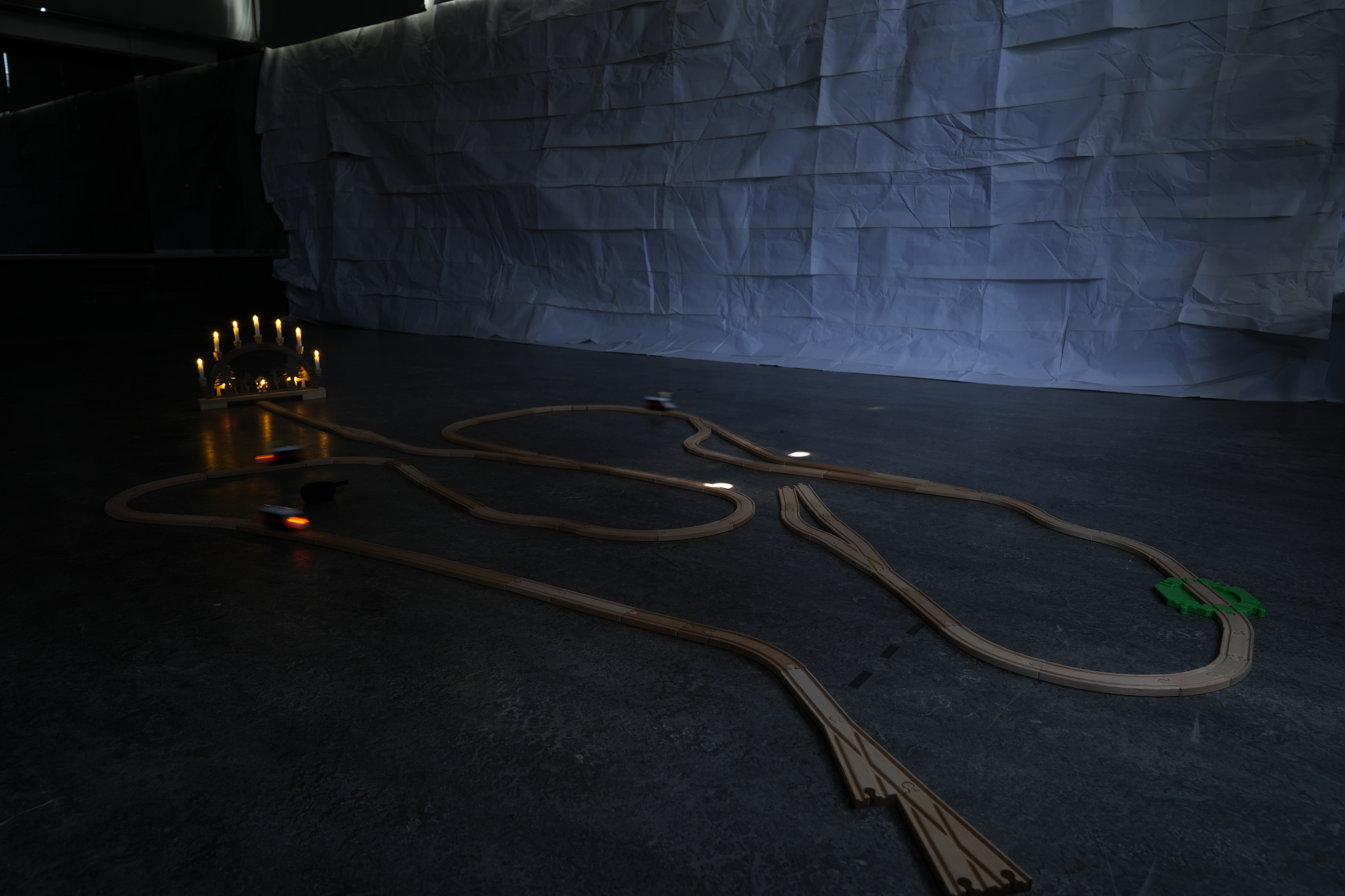 I imagined cuckoos which escaped the cuckoo clock and wandered around. While the cuckoo on a train is running on the trail, there are complicated cuckoo sounds in the installation. After cuckoo train go around the trail, the cuckoo train will break off the track. Then cuckoo train will crash to the screen. In the screen, the timelapse of my 7 hours sleeping is playing.